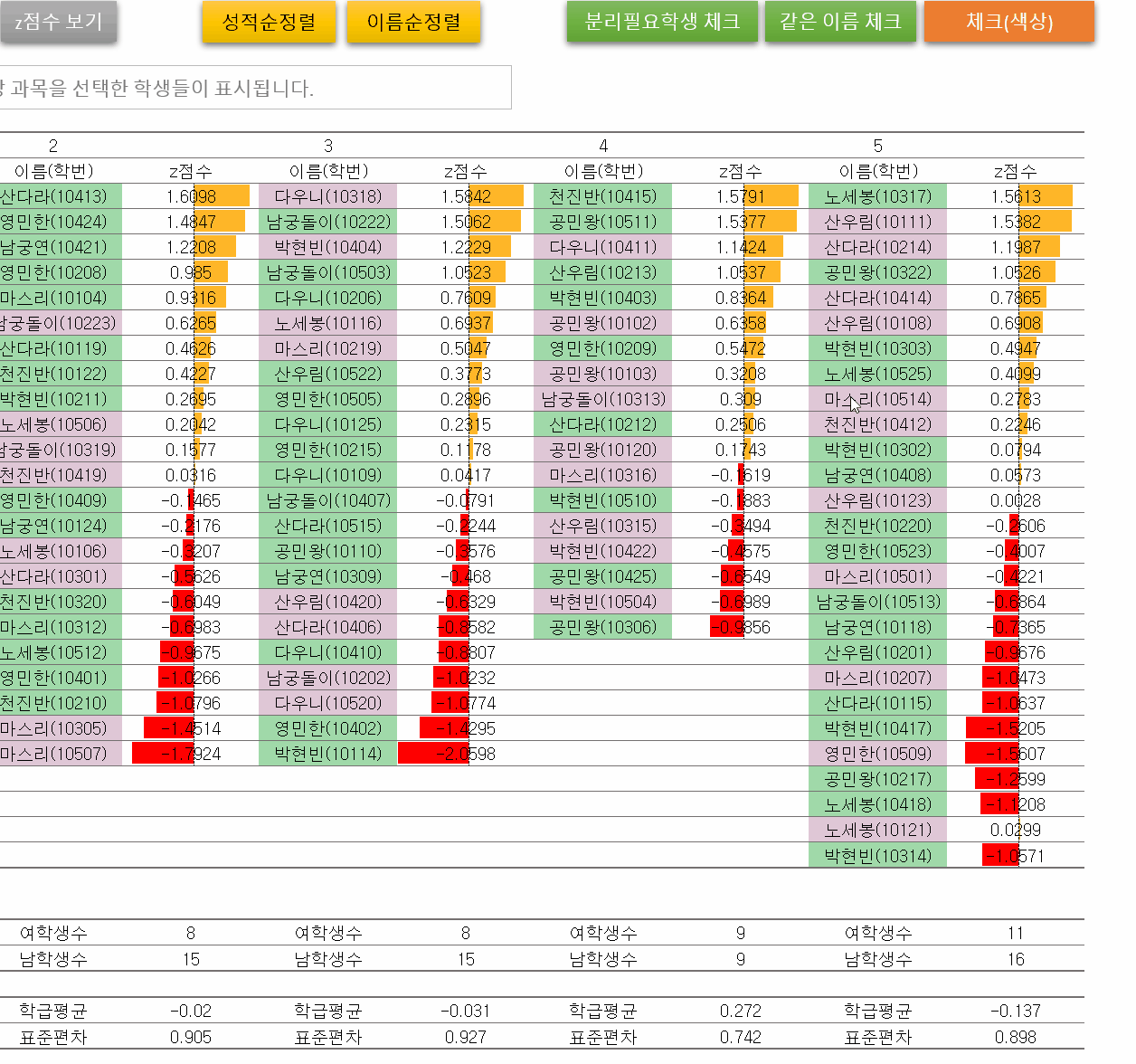 5) 상단의 체크(색상) 버튼 한번 누르면 하단에 학급평균, 표준편차, 과목별인원수 다시 계산됩니다.