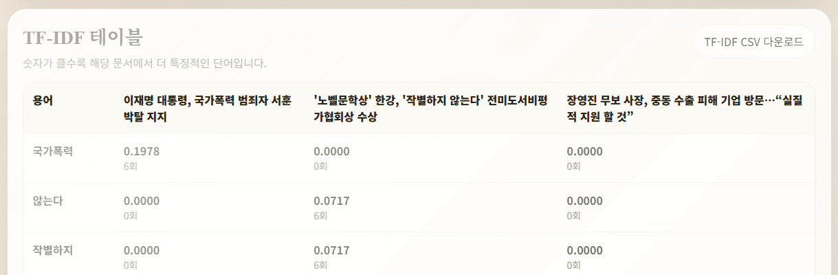 2022개정 인공지능수학, II. 텍스트 데이터 처리 단원 TF-IDF 개념이해를 위한 실습 수업을 준비하던 중